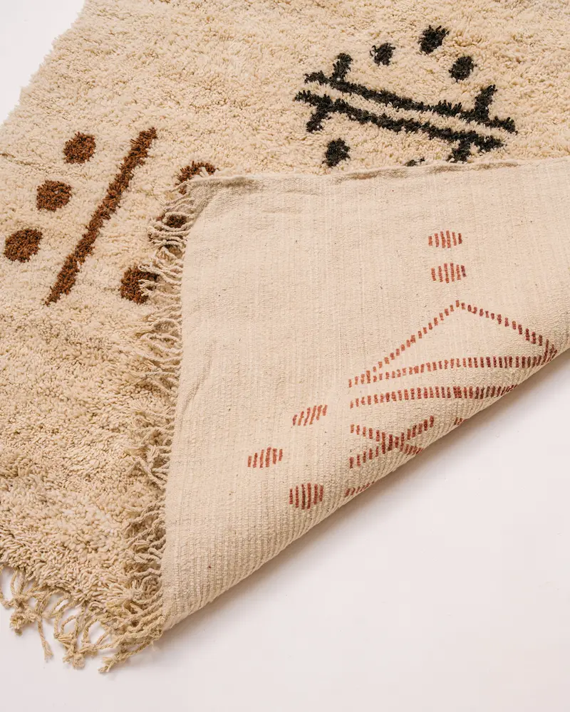 Tissé à la main dans le Moyen Atlas, ce tapis amazigh en laine 100 % naturelle est teint à partir de pigments végétaux selon des savoir‑faire ancestraux. Chaque motif symbolique raconte une histoire et chaque fil porte la mémoire des femmes qui l’ont tissé.